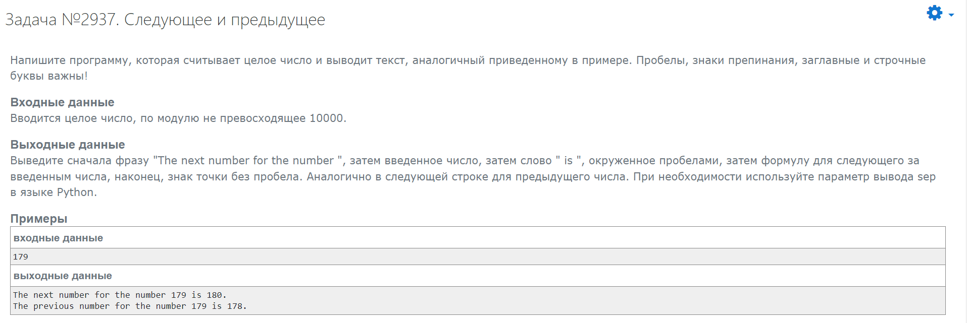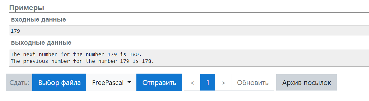 Сначала надо понять, что от нас хотят: тут все ясно, хотим вывести числа, которые на единицу больше и меньше некоторого нашего N. Размышляем, приходим к тому, что предыдущее число — \(N - 1\) , следующее — \(N + 1\)