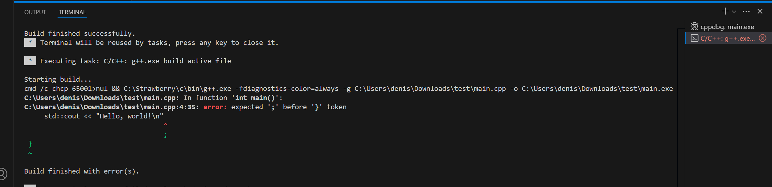 • запустить файл, нажав кнопки Run C/C++, посмотреть на вывод консоли, убедиться, что все работает
