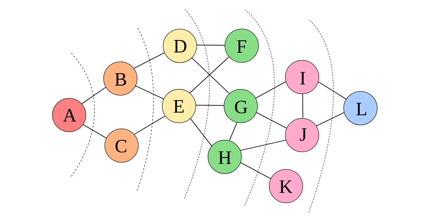 Поиск в ширину также называют обходом — так же, как поиск в глубину и все другие обходы, он посещает все вершины графа по одному разу, только в другом порядке: по увеличению расстояния до начальной вершины.